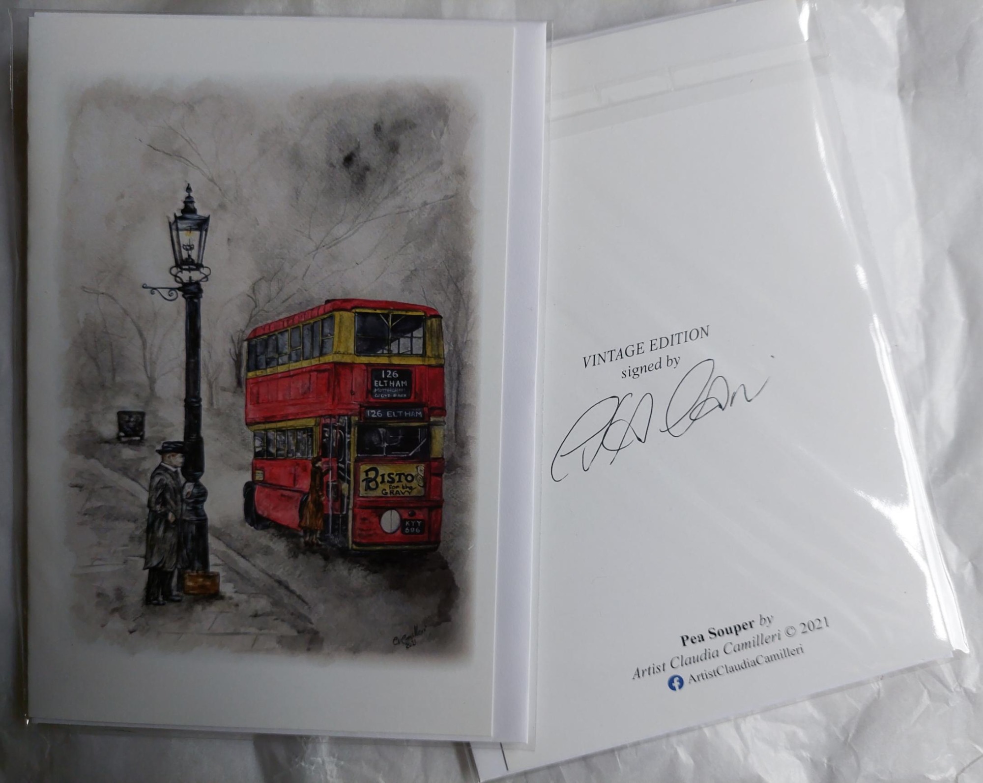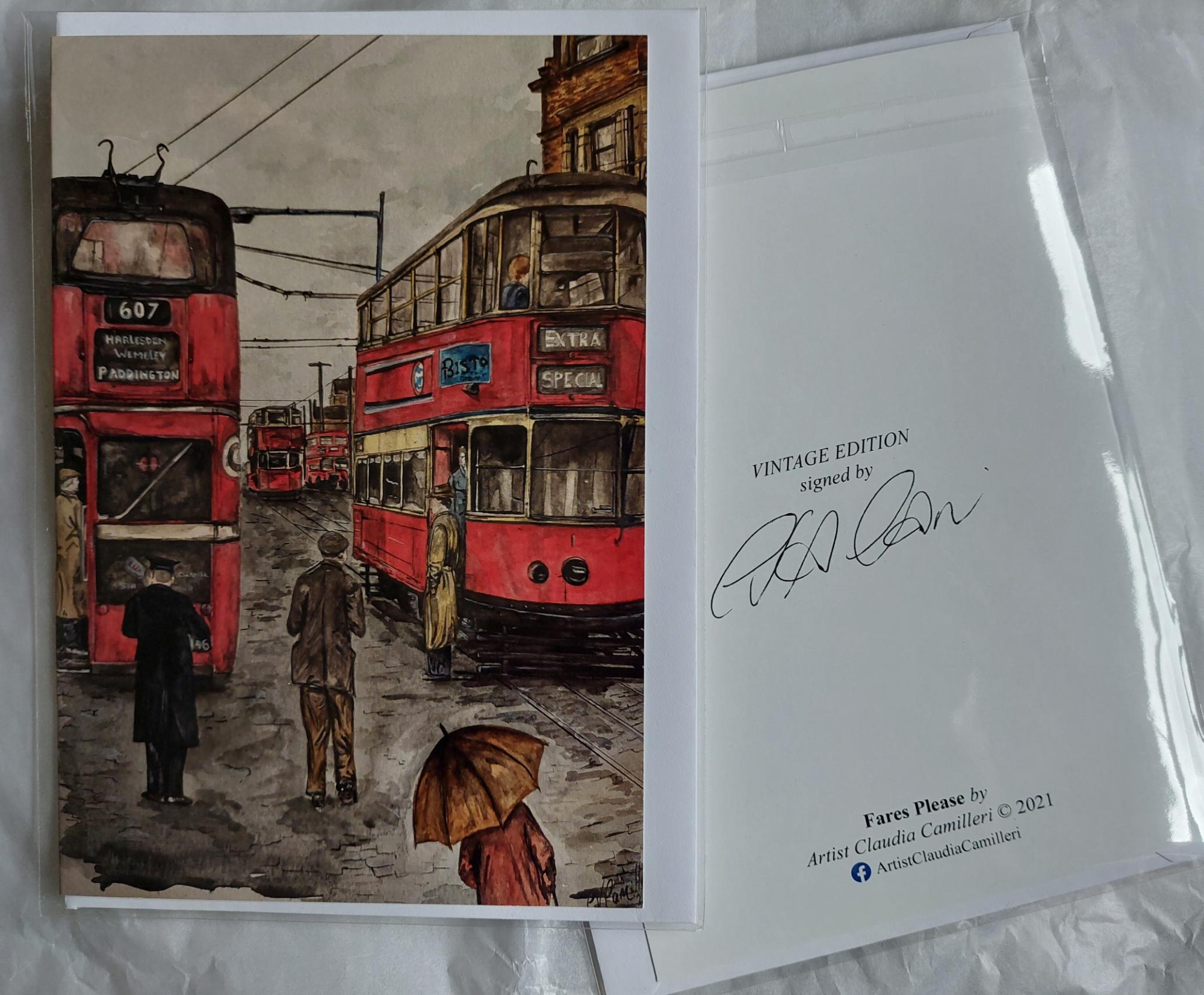 Design "Fares Please!" captures the essence of London travel with tram and Trolleybus from times gone by.