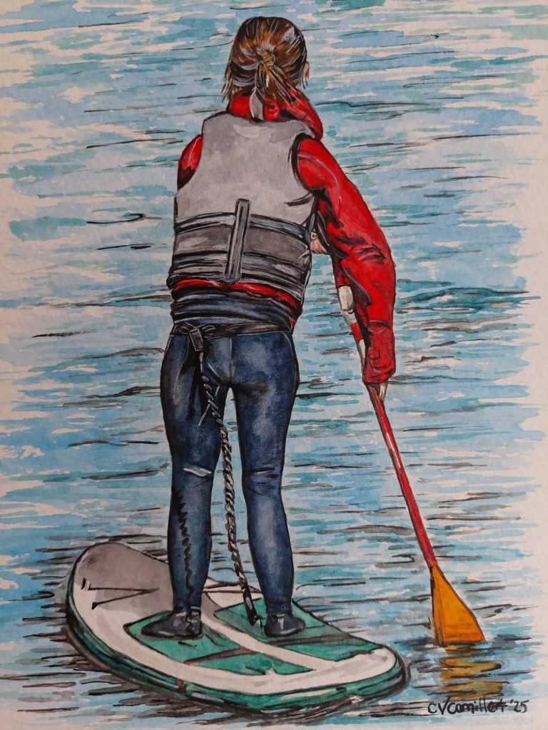 Rendered in watercolour on 8"x6" Aquarelle paper, this artwork depicts a paddle boarder demonstrating focus and proficiency while navigating the lake. The interplay of reflection and colour imbues the scene with vitality.